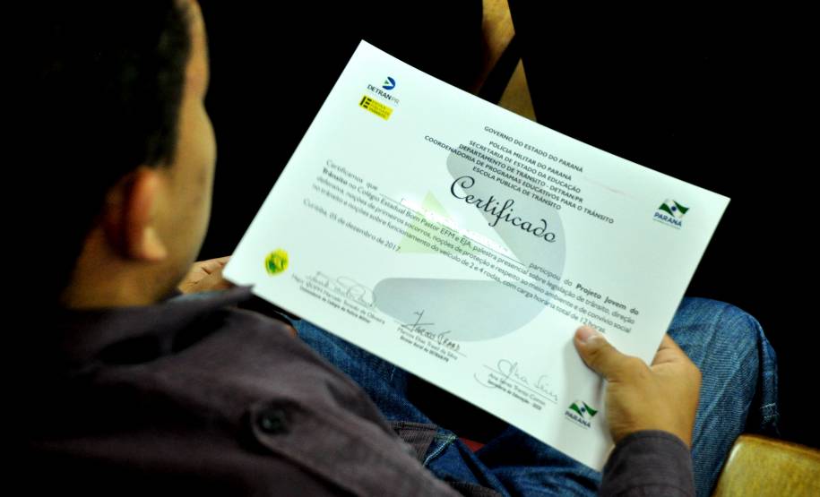 O Departamento de Trânsito do Paraná (Detran), a Secretaria de Estado da Educação e a Polícia Militar entregaram nesta terça-feira (5) os certificados aos alunos que participaram do projeto “Jovem do Trânsito”, no Colégio Estadual Bom Pastor e Colégio Homero Batista de Barros, em Curitiba.