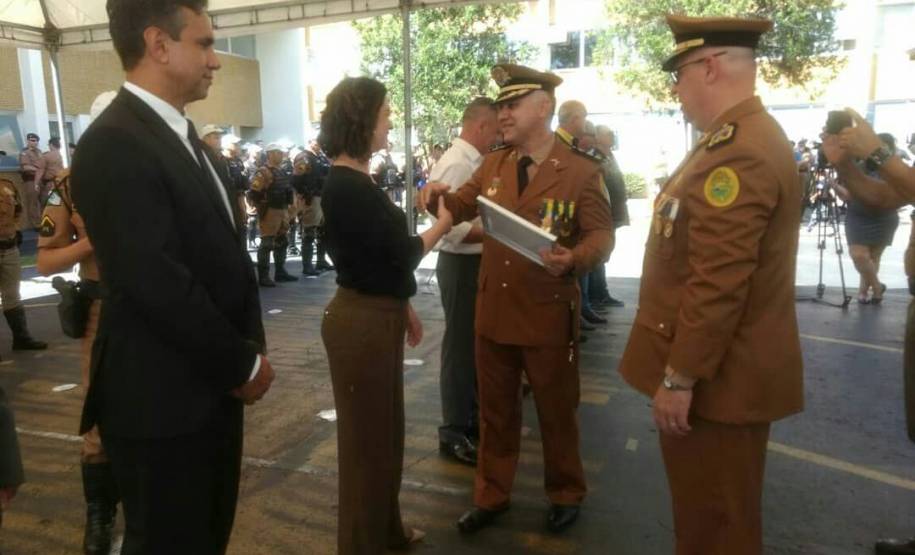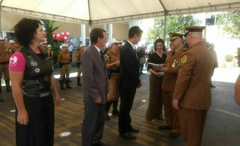 PRESENÇAS – Participaram da solenidade o Governador Beto Richa, o secretário da Segurança Pública, Júlio Reis; o secretário chefe da Casa Militar, coronel Elio de Oliveira Manoel; a secretária estadual da Família e Desenvolvimento Social, Fernanda Richa; o diretor-geral do Detran, Marcos Traad; o Comandante do 1º Comando Regional da PM (1º CRPM), coronel Péricles de Matos; o delegado-geral da Polícia Civil, Naylor de Lima; o Comandante do Corpo de Bombeiros, coronel Fábio Mariano de Oliveira; o Comandante do Batalhão de Polícia Rodoviária (BPRv),tenente-coronel Erich Osternack; o superintendente da Polícia Rodoviária Federal, Adriano Marcos Furtado; o secretário municipal de Defesa Social, Guilherme Rangel; o presidente da Fetranspar, coronel Sérgio Maluceli e a presidente do Provopar, Carlise Kwiatkionski.